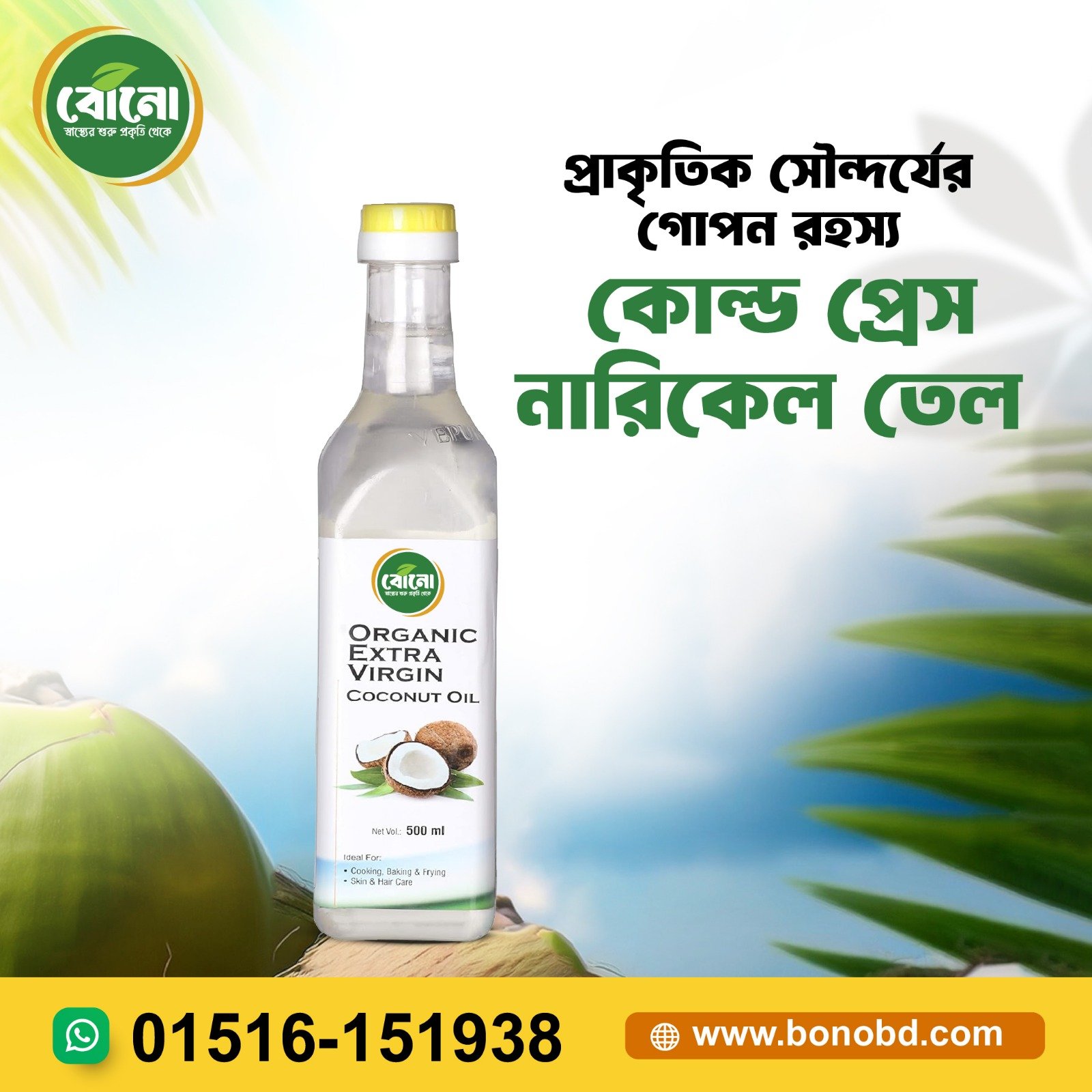 শ্রীলঙ্কার উষ্ণমণ্ডলীয় দ্বীপ ও বরিশাল-পিরোজপুরের তাজা নারকেল থেকে সংগৃহীত *100% খাঁটি ও অর্গ্যানিক নারকেল তেল*, যা কোল্ড-প্রেস পদ্ধতিতে তৈরি। এই পদ্ধতিতে তেল তৈরির সময় কোনো রাসায়নিক, কৃত্রিম প্রিজারভেটিভ বা অতিরিক্ত তাপ ব্যবহার করা হয় না, ফলে সব প্রাকৃতিক পুষ্টিগুণ, সুগন্ধ ও স্বাদ অক্ষুণ্ণ থাকে।